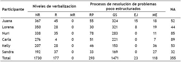 Se obtuvieron las frecuencias absolutas y relativas de los niveles de verbalización y los procesos de resolución de problemas poco estructurados. También se observó el comportamiento de estas variables a través de matrices espacio-estado.