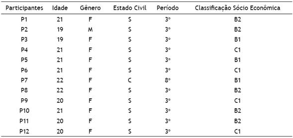 Participaram deste estudo qualitativo e exploratório doze estudantes universitários de uma instituição pública de Ensino Superior do curso de Psicologia do Estado do Rio de Janeiro. As informações demográficas dos participantes são apresentadas na Tabela 1.