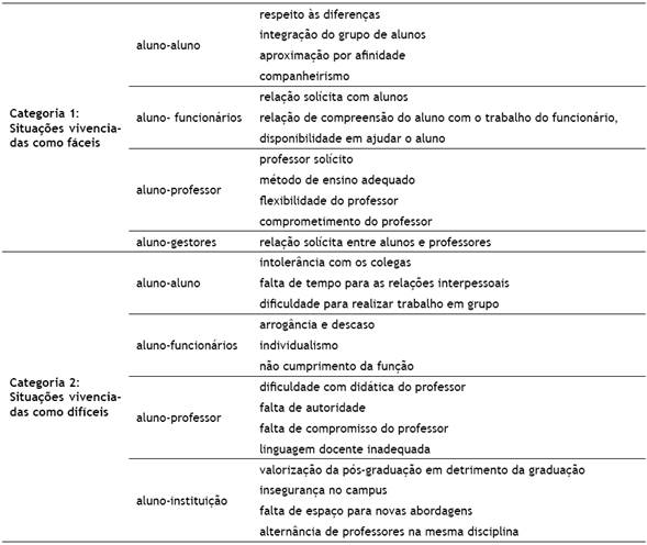 Uma vez organizadas as categorias e respectivas subcategorias, foram realizadas interpretações e inferências sobre o material. Na relação alunoaluno foram encontradas sete categorias, cujas mais significativas falas foram transcritas a seguir. As primeiras três se referem a situações julgadas como difíceis e as outras quatro, como fáceis: Intolerância com os colegas: "... você não pode falar isso porque meu pastor, porque meu não sei...", "Há preconceito também quanto à sexualidade."; Falta de tempo para relações interpessoais: "Todo mundo tem uma vida corrida, tem gente que faz estágio, trabalha, estuda fora, faz curso, vem correndo e os intervalos são de dez minutos, então não têm tempo para parar e se conhecer melhor."; Dificuldade para realizar trabalho em grupo: "Ninguém consegue chegar até o final porque sempre tem confusão." As falas evidenciam momentos de vivências consideradas difíceis entre os estudantes em que relações interpessoais estabelecidas de forma inadequada podem afetar os resultados acadêmicos, ratificando os dados obtidos por Soares A. B. e Del Prette, Z. (2013).