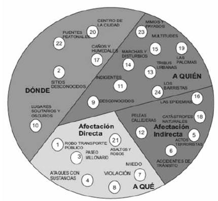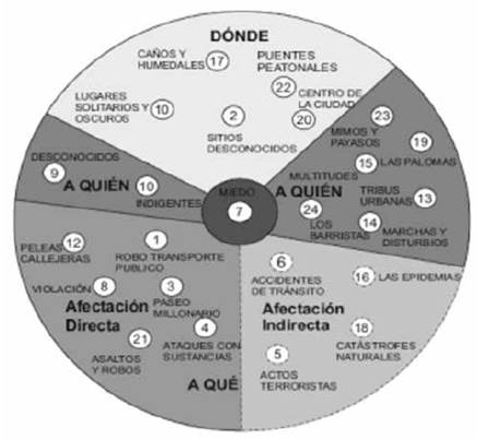 Dentro de los resultados arrojados por el programa para computador PERMAP, a través de las gráficas, se ha podido develar que el miedo se organiza a partir de una estructura conceptual que identifica "lo temido", con afectación directa (atraco, violación, ataque con sustancias, etc.) o indirecta sobre el individuo (pestes, accidentes, etc.); los "lugares" asociados al miedo; y los "agentes" del miedo.