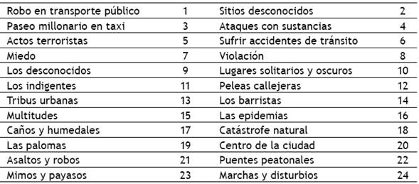 La inclusión de la tarjeta "miedo" obedeció al interés de explorar las asociaciones entre las distintas situaciones con el temor. La tabla 1 describe las 23 situaciones que se asocian de manera más frecuente al miedo en la ciudad, más la tarjeta "miedo", conformando así el dominio del estudio.
