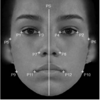Puntos utilizados para medir la asimetría en los rostros. El plano de la simetría (PS) se midió promediando la media de la distancia entre los puntos (por ejemplo: la media de P1 y P2). Cada característica del rostro de derecha e izquierda, fue medida de la siguiente manera: ojo exterior (PS–P1, P2–PS), ojo interno (PS – P3, P4 – PS), ancho del ojo (P3 –P1, P2 – P4), cara (PS – P5, P6 – PS), nariz (PS – P7, P8 – PS), mandíbula (PS – P9, P10 – PS) y boca (PS – P11, P12 – PS).