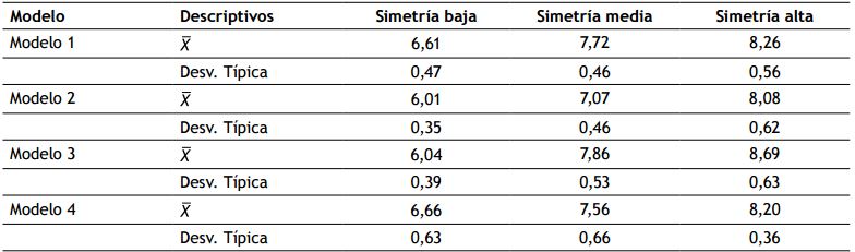 En cuanto a la primera hipótesis, los resultados en la tabla 1 muestran que los participantes tuvieron una mayor preferencia por los rostros con alta simetría, los cuales arrojaron mayores puntajes en las cuatro modelos utilizadas. Adicionalmente, los datos revelan que no existen grandes diferencias en las evaluaciones entre-modelos en función de cada una de las simetrías.