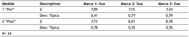 Respecto al análisis de las medias en las evaluaciones realizadas a las marcas durante las etapas previa y posterior al condicionamiento —hipótesis 2—, como se puede observar en la tabla 2, en la etapa de precondicionamiento, no hubo un sesgo de favorabilidad o preferencia por alguna marca en especial y, por consiguiente, Xua, Xue y Xuo se comportaron como estímulos neutros.