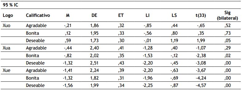 Como se observa en la tabla 3, las marcas tuvieron un cambio en las calificaciones de las etapas pre y post. La marca Xua que fue asociada a la simetría media tuvo diferencias estadísticamente significativas en las puntuaciones de dos de las tres escalas empleadas, bonita y deseable; por su parte, la marca Xue apareada al rostro con alta simetría, mostró un cambio estadísticamente significativo p<.05 en las tres escalas (agradable, bonita y deseable).