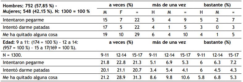 Describe que al 38 % de la muestra le han intentado pegar siendo bastante para el 7 %, para los chicos es del 5 % y las niñas del 2 %, además al 30 % intentan darle patadas y al 44 % le han quitado algo. Esto sucede entre los 9 a 17 años, su frecuencia puede ser a veces en el 20 % a 30 %, y bastante al 4.3 % a 7.2 % de intentar golpear, patear o quitar algo.