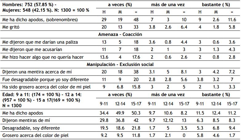 Se describe que les dicen apodos al 69.6 %, para los 9-11 años es del 55.6 %, de los 12-14 años es del 72.9 %, y entre los 15 a 17 años es del 69.7 %, le han gritado al 45.2 %, amenazan con darles una paliza al 26 % y que los acusarán de algo al 25.3 %, coaccionan al 23 %, dicen mentiras del estudiante al 53.3 %, de los 9-11 años es del 45.8 %, de los 12- 14 del 57.4 % y de los 15-17 años es del 63.3 %, el 32.6 % siente que lo tratan de forma desagradable por como es, y al 24.1 % son desagradables por el color de la piel, entre los 9-11 años es del 16.7 %, de los 12-14 años es del 16.2 % y entre los 15-17 años es del 13.5 %.