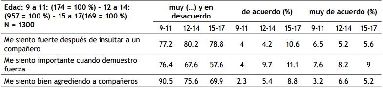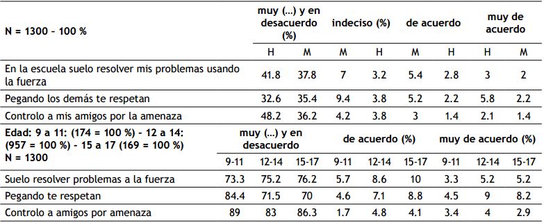 Se intimida y se utiliza la fuerza para resolver conflictos en el 13.2 % en donde el 5 % está muy de acuerdo y es más frecuente en hombres con el 3 % que en mujeres con el 2 %. Además están de acuerdo entre los 9 a 11 años el 9 %, y muy de acuerdo el 3.3 %, entre los 12 a 14 años es del 13.8 % estando muy de acuerdo el 5.2 %, y entre los 15 a 17 años es del 15.2 %, estando muy de acuerdo el 5.2 %, y se considera que si golpeas tendrás el respeto de otros para el 15.4 %, estando muy de acuerdo el 5.8 % de chicos en diferencia de un 2.2 % de chicas en donde a los 9 a 11 años, el 9.1 % está de acuerdo, y muy de acuerdo el 4.5 %, de los 12 a 14 años el 16.1 %, y entre los 15 a los 17 años el 17 %, estando muy de acuerdo el 8.2 %. Y controlan a otros con amenazas el 7.9 %, en donde están muy de acuerdo los chicos en el 2.1 % y las chicas el 1.4 %, de los 9 a 11 años el 5.1 %, a los 12 a 14 años el 8.8 %, estando muy de acuerdo el 4 %, y entre los 15 a 17 años el 7 %, estando muy de acuerdo el 2.9 %.