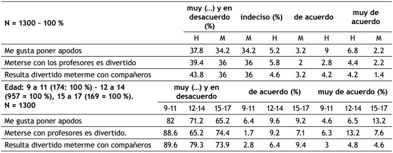 Lo hace para divertirse poniendo apodos el 19 %, estando muy de acuerdo los hombres con el 6.8 % y las mujeres con el 2.2 %, y de los 9 a 11 años el 11 %, para los 12-14 años el 16.1 %, estando muy de acuerdo el 6.5 %, y de los 15-17 años el 22.4 %, estando muy de acuerdo el 13.2 %. Piensan que es divertido meterse con los profesores el 9.4 %, están muy de acuerdo el 4.4 % de chicos y el 2.2 % de chicas, respecto a su edad entre los 9-11 años el 8 % está de acuerdo, el 6.3 % muy de acuerdo entre los 12 a los 14 años es del 22.4 %, están muy de acuerdo el 13.2 % y entre los 15-17 años es del 14.7 %, y están muy de acuerdo el 7.6 %.