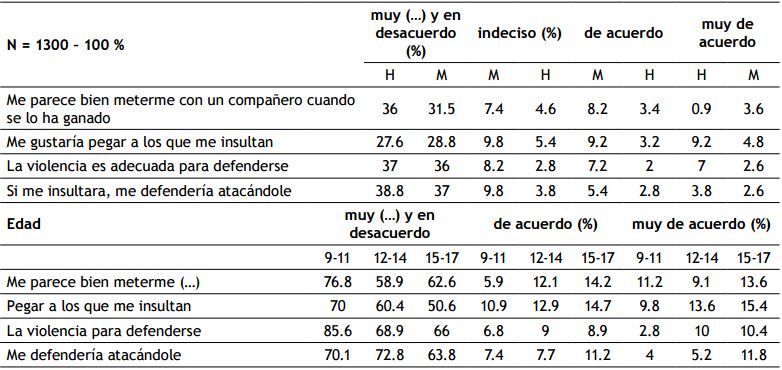 Los estudiantes consideran que está bien meterse o agredir a alguien si se lo ha ganado en un 16.1 %, de los 9 a 11 años el 17.1 %, de los 12 a 14 años el 21.2 %, y de los 15 a 17 años el 27.9 %, y golpearía a los que lo han insultado el 27.4 %, en donde para los 9 a 11 años el 20.7 %, de los 12 a 14 años el 26.5 %, y entre los 15 a los 17 años el 30.1 %, y piensa usar la violencia para defenderse el 18.8 % de 9 a 11 años el 9.6 %, de los 12 a 14 años el 19 %, y de los 15 a 17 años el 19.3 %, y se defendería atacando el 14.6 %, de 9 a 11 el 11.4 %, de 12 a 14 años el 12.9 %, y de 15 a 17 años el 23 %.