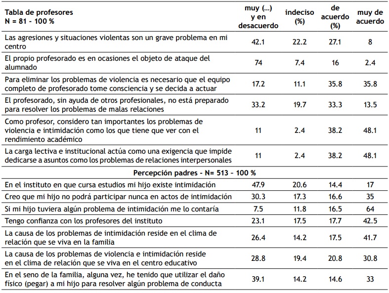 Los profesores describen que la existencia de la intimidación en su institución es del 35.1 %, siendo agredido el 18.4 %, y cree que se debe tomar consciencia para actuar el 71.6 %, pero el 46.8 % no se siente preparado para abordar el tema, y el 86.3 % considera que es un problema importante pero que no se reflexiona porque la carga laboral no lo permite en el 86.3 %.