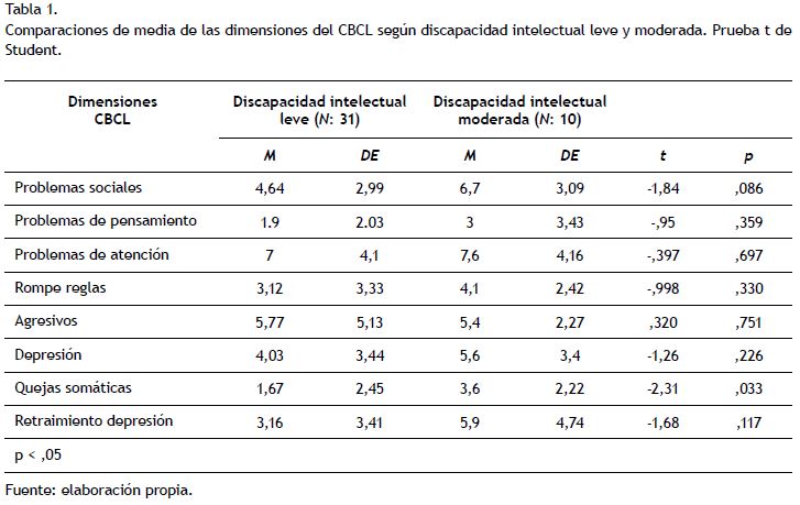 Se encontró que, según la percepción parental, los niños con discapacidad intelectual moderada presentaban más quejas somáticas (p = ,033) comparados con sus pares con discapacidad intelectual leve. Si bien no se observó otra diferencia estadística significativa, un análisis de tendencias mostró que los niños con discapacidad intelectual moderada presentaban mayor recurrencia de problemas sociales, de pensamiento y de retraimiento-depresión. En tanto sus pares con discapacidad intelectual leve referían más problemas agresivos (Tabla 1).