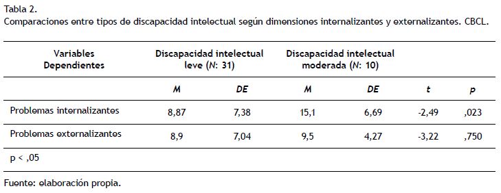El segundo objetivo del trabajo fue analizar problemáticas en las dimensiones internalizantes y externalizantes en niños con discapacidad intelectual leve y moderada. Los resultados arrojaron mayor presencia de problemas internalizantes en los niños con discapacidad intelectual moderada comprados con sus pares con discapacidad intelectual leve (Tabla 2).