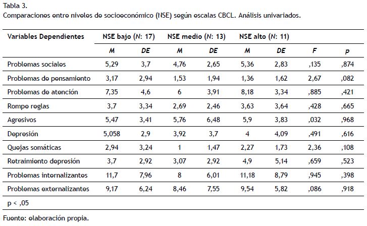 Posteriormente, se analizó la relación del contexto socioeconómico en los problemas emocionales y de comportamiento de niños con discapacidad intelectual. Si bien no se encontraron diferencias estadísticas entre los grupos, se observó que los niños con discapacidad intelectual pertenecientes al nivel socioeconómico bajo referían mayor frecuencia de problemas de pensamiento respecto a sus pares de otros contextos socioeconómicos (Tabla 3).