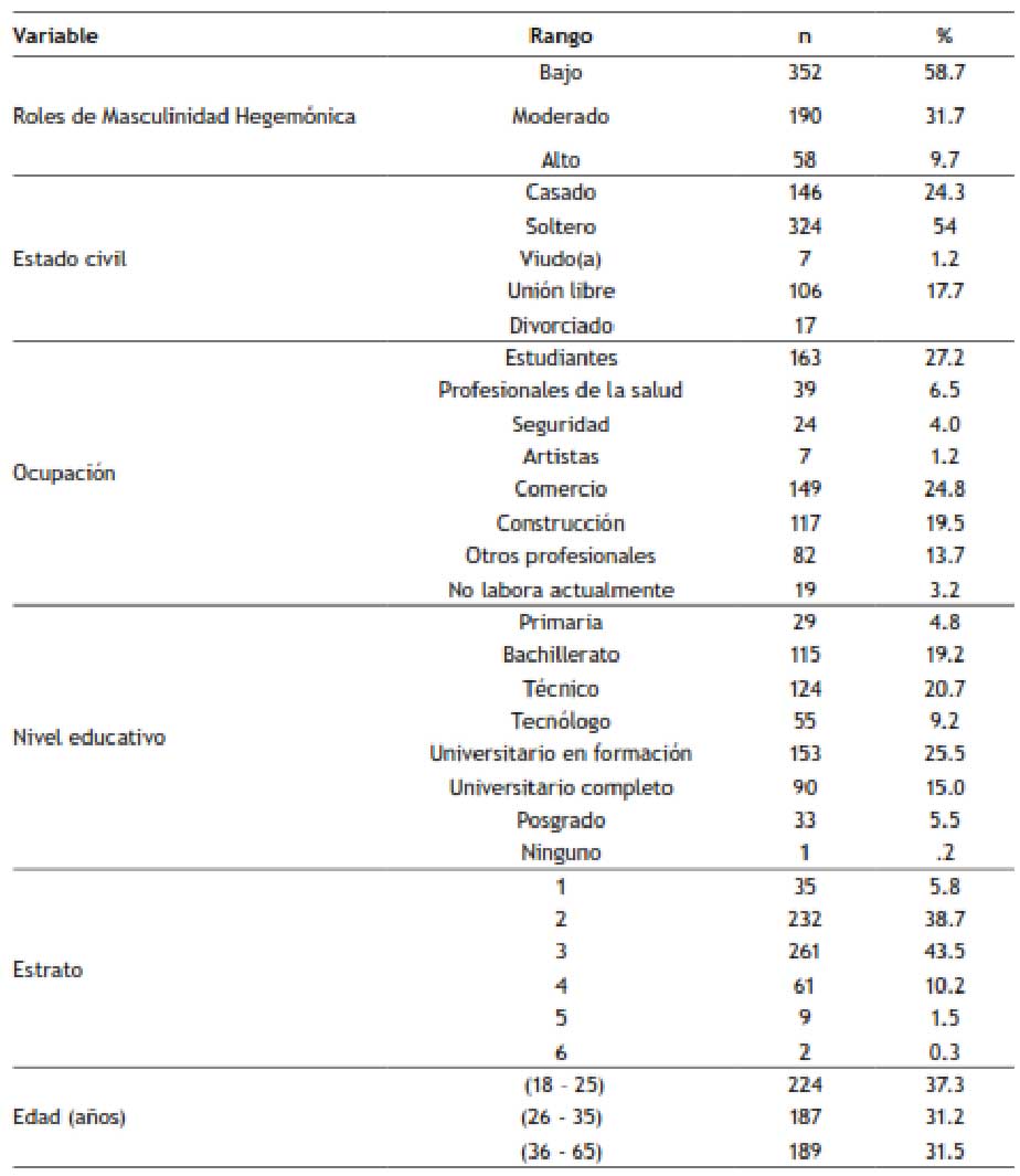 La tabla 1 refleja las características más sobresalientes de la muestra. Se observa que la mayoría de los participantes se encuentran en un rango bajo de adherencia a los roles de masculinidad hegemónica; en su mayoría son jóvenes universitarios (25.5 %), técnicos (20.7 %) o con bachillerato terminado (19.2 %). El 52 % solteros y el 82 % pertenecían a estratos dos y tres