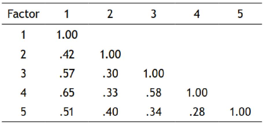 Los resultados del índice KMO (0.92) y el valor de significancia para la prueba de esfericidad de Bartlett (7271.56; p<.001) señalan que la matriz de correlaciones no es una matriz de identidad y es factible realizar el análisis factorial. Así, se procedió a realizar un AFE mediante el método de extracción de “factorización del eje principal” debido a que los factores mostraron correlaciones entre sí mayores de 0.20, véase tabla 2.
