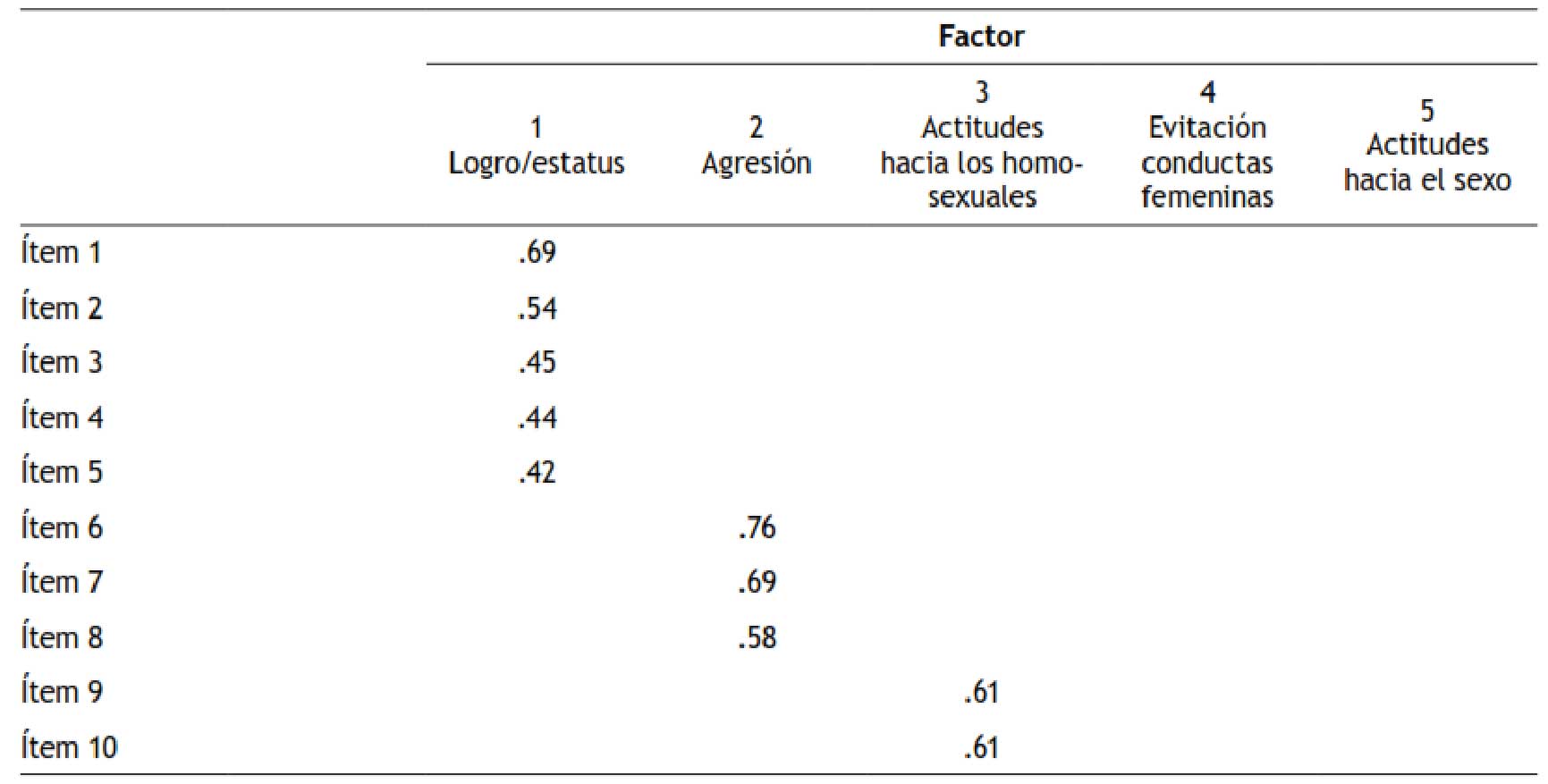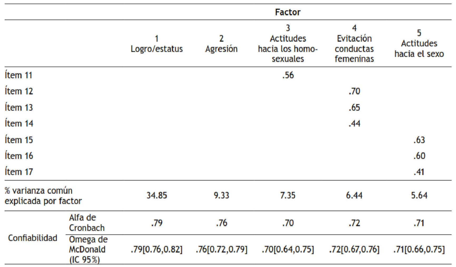 El AFE encontró cinco factores correlacionados entre sí, indicando que los factores son parte de una realidad teórica común llamada masculinidad hegemónica. Dichos factores estuvieron compuestos por ítems con pesos factoriales mayores a .40, conforme a rigurosos estándares exigidos (MacCallum, Widaman, Zhang & Hong, 1999; Williams, Brown & Onsman, 2010). En el presente estudio, cada factor estuvo compuesto por un número adecuado de ítems (mayor o igual que tres) y hubo correspondencia entre la agrupación de los ítems según los factores donde se esperaba que cargaran. Para hacer una comparación, ver la versión de Levant et al. (1996) que presentan los ítems completos del inventario.