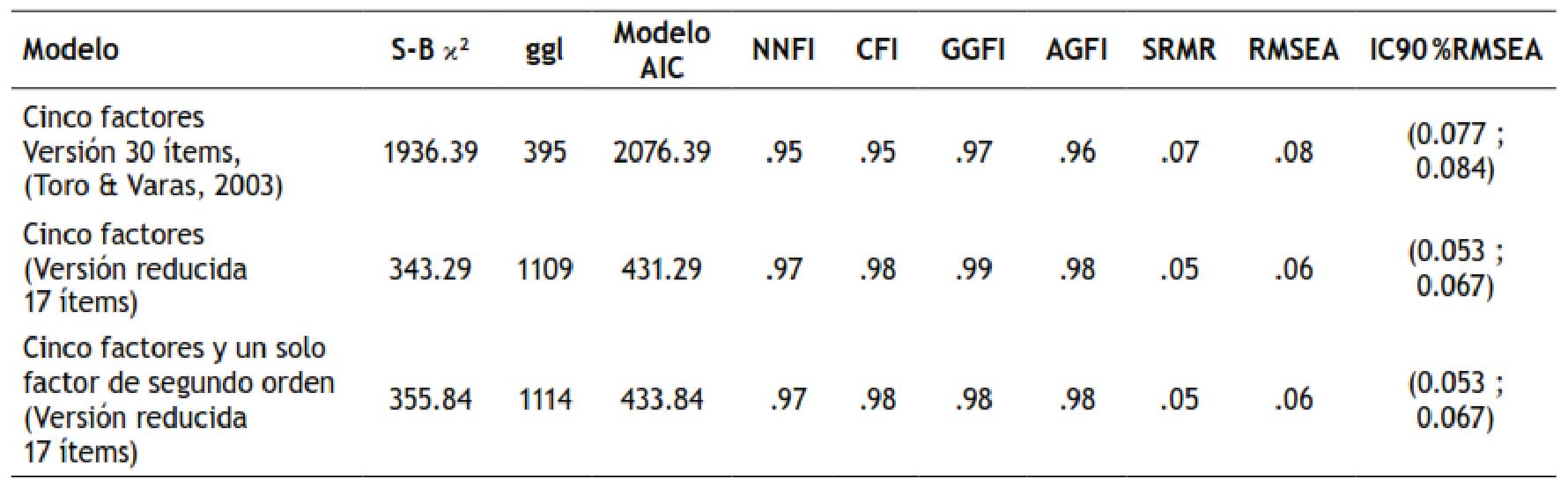 En general, el modelo de cinco factores es mejor al modelo de cinco factores más uno de segundo orden, ya que el valor del índice AIC es más bajo. De las dos versiones de 30 y 17 ítems, la versión reducida resulta con mejores índices de ajuste. Es de notar que el método de extracción del AFC aplicado es DWLS (Diagonally weighted least squares) y este método es recomendado cuando no se cumple la normalidad multivariada (Jöreskog, Sörbom, Totit & Du toit, 2001; Morata-Ramírez et al., 2015).