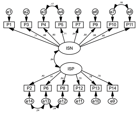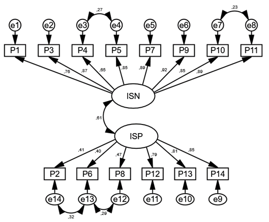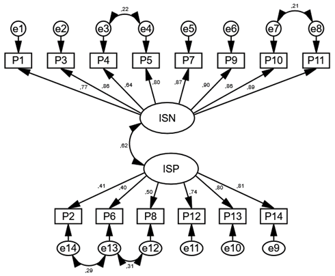 La figura 2 se muestra la estructura de los dos factores que componen la IS obtenida a partir de la muestra colombiana, de acuerdo con el modelo hipotético. El factor de ideación suicida negativa, presenta unas cargas factoriales adecuadas entre 0.65 y 0.92, obtenidas por los ítems 4 y 9 respectivamente. Mientras que el factor positivo presentó coeficientes entre 0.40 (ítem 6) y 0.85 (ítem 14).