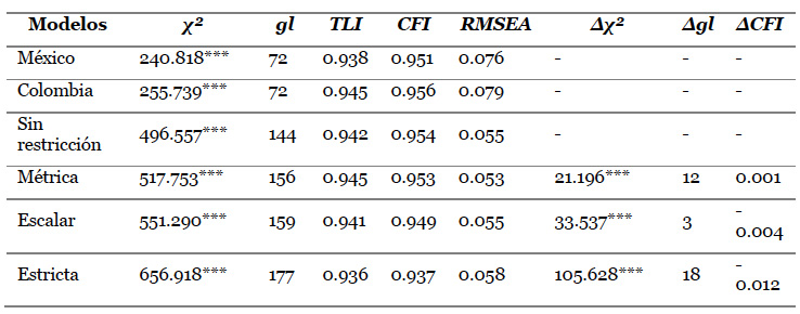 A continuación, se observaron las variaciones por cada país en un análisis de invarianza, teniendo en cuenta que el χ2 como único indicador de máxima verosimilitud requiere un valor p > 0.05 para aceptarla, se requieren tener en cuenta las variaciones por cada restricción secuencial a los modelos anidados (modelo Sin restricción, invarianza Métrica ―Measurement weights—, invarianza Escalar —Structural covariances—, e invarianza Estricta —Measurement residuals—). Se han recomendado tener en cuenta los cambios de los valores CFI entre cada uno de los modelos anidados, con un punto de corte sugerido de ΔCFI = < 0.01 (Cheung y Rensvold, 2002).