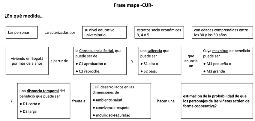En este trabajo, las facetas de contexto caracterizan a las personas que participaron de estudio, cuyo nivel educativo es universitario, viven en estratos socio económicos 3, 4 o 5, estan en edades comprendidas entre los 30 y los 50 años y que llevan viviendo en Bogotá (Colombia) por los menos 3 años. Las facetas de dominio definidas para hacer la exploración de las valoraciones que hacen los individuos entre CUR y conductas de cooperación o de egoísmo fueron: a) elección por un comportamiento, conformada por los elementos: comportamiento cooperativos y comportamiento egoístas; b) la consecuencia social por el comportamiento, cuyos elementos son aprobación o reproche; c) saliencia del anuncio, cuyos elementos son: saliencia alta o saliencia baja, d) magnitud del beneficio anunciado, conformada por los elementos: magnitud pequeña o magnitud grande, e) distancia temporal del beneficio, conformada por los elementos: distancia temporal corta o distancia temporal larga, y f) dimensión donde se presenta el CUR cuyos elementos son: ambiente-salud, convivencia-respeto y movilidad-seguridad. La figura 1 muestra la frase mapa que orientó las observaciones del estudio.