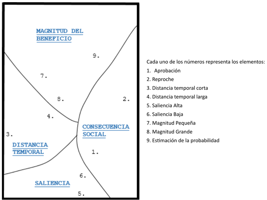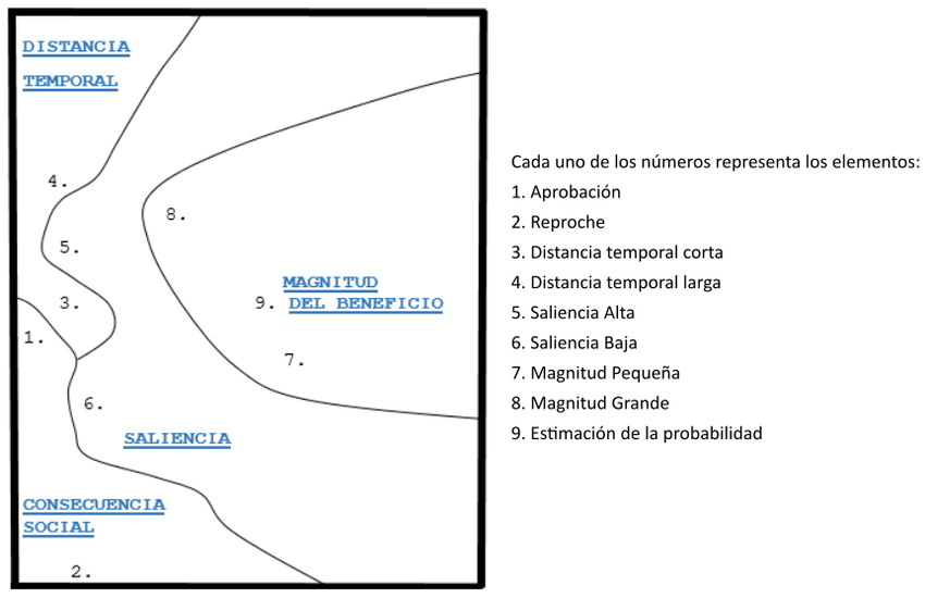 Con relación a los CUR que implican Convivencia, se observa en la figura 3 que los factores de aprobación y reproche se ubican en la zona inferior izquierda del plano, formando la región de “consecuencia social”. Así mismo, los elementos de distancia temporal corta y larga se agrupan en la región “distancia temporal”. Debido a su proximidad, la probabilidad de realizar un CUR con los elementos de magnitud grande y magnitud pequeña del beneficio se ubican en la región de “magnitud del beneficio”. Las saliencias del anuncio, baja y alta, se agrupan en la región “saliencia”. De esta manera se confirma de nuevo la frase mapa para este tipo de CUR. Es destacable que la “estimación de la probabilidad” nuevamente queda ubicada en la región de “magnitud del beneficio”.