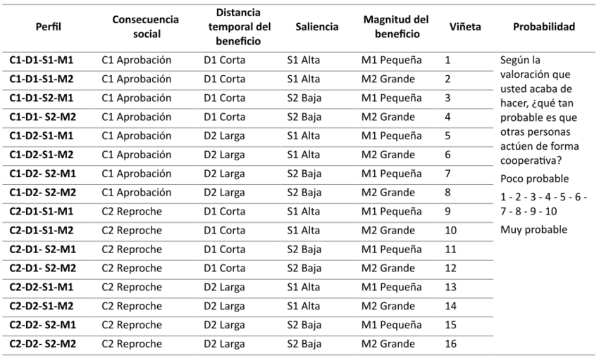El estudio empleó un cuestionario compuesto por 48 viñetas derivadas de los perfiles de la frase mapa, que describían diferentes situaciones urbanas cotidiana, sobre las cuales el participante debía valorar las posibles decisiones que tomaban los personajes hipotéticos frente a los distintos comportamientos a las que hacía referencia la viñeta, a partir de las cuatro facetas: la consecuencia social, distancia temporal del beneficio, saliencia del beneficio y la magnitud del beneficio (ver tabla 2). Después de estas valoraciones, el participante debería estimar la probabilidad con que el personaje podría optar por el comportamiento implicado en la viñeta.