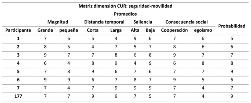 Con base en las viñetas y sus diferentes escalas de valoración, los participantes indicaron qué tanto podían influir la saliencia del anuncio, la consecuencia social, la distancia temporal y la magnitud del beneficio en la toma de decisiones cooperativas o egoístas del personaje de la viñeta. De este modo se promediaron las valoraciones que hicieron los participantes sobre cada uno de los 8 elementos, 2 por faceta, que se exploraban dentro de las viñetas y sobre la estimación de la probabilidad de que el implicado en la viñeta optara por una decisión egoísta o cooperativa en relación con un CUR.