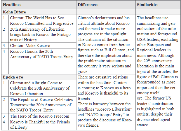 The analysis of the samples from the two outlets demonstrates the production, reproduction, and strengthening of the dominant ideological discourse in these newspapers which is in tune with their goal of persuasion, supported by the respective selection of the sources, quotations, historical background, photos, as well as with the linguistic choices. Although these two newspapers belong to different ideological positions, Epoka e Re being close to the state apparatus whereas Koha Ditore displaying a strong note of opposition, both of them contribute to the construction and preservation of the dominant discourse of Kosovo political friends, using this discourse for their ideological purposes.