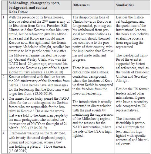 Although the news headlines in Kosovan media typically contain one sentence and therefore have a lot of information, the headlines used during the 3 days around the anniversary celebration include reduced and generalized information. By the thematic model of van Dijk about the transfer of the information within the macrostructure, there are no explanations about who is the hero and who are the friends, neither time and nor place of the ceremony are specified, however, this information is provided with the photos and other elements. The comparison of the illustrations used in both outlets further reinforces the similarities and differences which are depicted in the headlines.