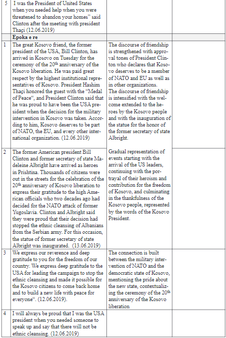 By the model of van Dijk, the scheme of the friendship discourse is additionally presented cyclically, as in the paragraph of Epoka e Re, where the USA is presented as a friend of Kosovo not only under the leadership of the democratic party but also afterward in the period when the conservative party was in power. The continuity and the repetition of the friendship strengthen the dominant discourse, which is intensified with the declaration of Clinton about what Kosovo deserves. The cyclical repetition of the friendship produces the same discourse which continues with other categories of the news, such as declarations of Kosovo’s Prime Minister and President, who are emphasized in Epoka e Re.