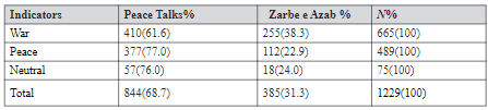 T-test, Peace talks (M= 1.58, SD =0.61), and Operation Zarb e Azab (M=1.38, MD=0.57) conditions; t (1229) = 5.319, p = .001. Overall, the coverage of peace talks was significantly higher than operation Zarbe e Azab, while WJ coverage was higher (61.6) than operation Zarbe e Azab (38.3). But also, peace talks got more peace-oriented cover- age (77.0) than operation Zarbe e Azab (22.9), whereas the number of neutral news (75) during the whole year, peace talks (76.0) followed by military operation (24.0).
