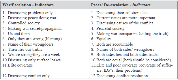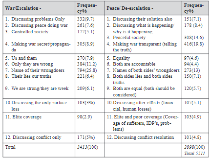 The analysis of the story into four main parts will help to establish which part of the story to be used as peace- or war-oriented. Stories were analyzed keeping in view and twelve peace & twelve war indicators based on Galtung’s (1986) taxonomy of peace war indicators (Table 1). Each news story was analyzed for its tone at four given levels, the score of 01 was recorded if the first part (lead or sub-lead) falls into the peace or war category; hence, if all the four parts of the story were peace-oriented, the score of peace orientation was recorded. Similarly, if overall the story consists of more peace frames, it was recorded as peace-oriented, and if there were more war indicators, it was classified as war-oriented, and if both were equal, it was considered neutral (Maslog & Lee, 2005).