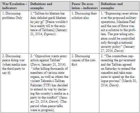 The data of “Dawn” & “Jang” were collected manually from the library archive since Dawn and Jang’s online versions are not in the form of a complete page, which makes it difficult to analyze the size & placement of the story at the front page. Images of the whole page were taken and then were shifted to the computer for analysis. The data from The Nation1 and Express2 was collected from the online version of newspapers websites and The pilot study of the content indicated that not all of the thirty-four indicators introduced by Johan Galtung’s (1986) classification of war and peace journalism are existent in the coverage, so only twelve of war and twelve of peace indicators were selected from Galtung (1986) classification.