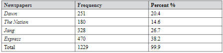 During one year N was 1229, among them the highest news stories on the issue were produced by Express (470) followed by Jang (328), Dawn (251), and The Nation (180).