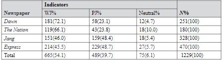 Although WJ indicators were the strongest in the overall coverage of newspapers, the highest percentage of WJ indicators were seen in the coverage Dawn, with nearly 72% of the news being war-oriented, followed by The Nation (66.1%), Jang (46%), and Express (45.5%). In terms of the structure of the news, overall WJ were more dominant than PJ or neutral coverage.