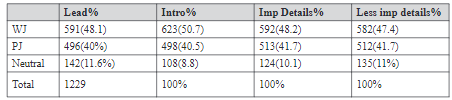There was a significant difference in terms of WJ/PJ reporting of different portions of the news. WJ was more dominant in all the portion of news than PJ and neutral. The “Intro” section of the news stories was more war-oriented (50.7%) than the other three parts of the story.