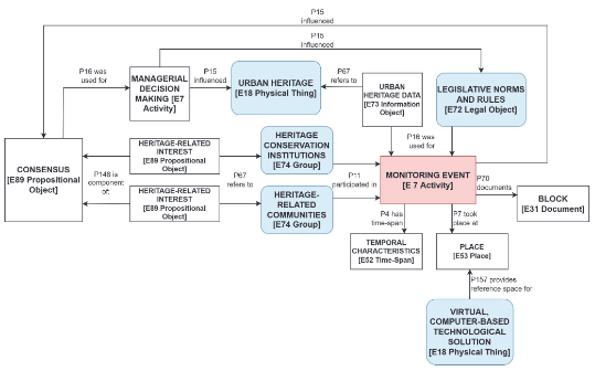In the context of the topic of this article, the DLT-based approach can be used as the background of the modelling. In this case, UHP can be perceived as an iterative process – the set of urban heritage monitoring activities - as actions intentionally carried out by actors that result in changes of state in the cultural, social, or physical systems documented (Bekiari et al., 2021). The informative results of iterations are documented in the blocks - as identifiable immaterial items that make propositions about reality (Bekiari et al., 2021). The blocks are related to the chain and in this mode form the information structure of UHP. The conceptual model of one iteration (monitoring event) is represented in Fig. 2. The letters “E” (e.g. E73) and “P” (e.g. P67) refer to the corresponding CIDOC-CRM classes and properties.