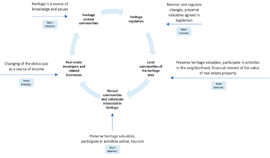 This conceptual framework suggests a possible ecosystem (Fig. 3) of: different groups of interests, different incentives of acting, new possibilities to come up to consensus and new ways of managing difficult, diverse and highly interconnected cultural heritage areas such as oldtowns. This ecosystem (Fig. 4) implies ordinary parts, agencies or elements where some interests are the same between almost all and some are directly opposite. Hence the heritage field is well known for having everlasting conflict where one side wants stability and preservation of status quo and another part- wants new constructions and reshaping the status quo which always bring tensions or losses.