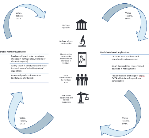 Communities with a new way for participation could emerge with an incentivized dialogue between (Fig. 3): regulators, real estate developers, business, local communities and international communities (if that heritage area is a matter for all, like objects in the World Heritage List of UNESCO). Proposed ecosystem could be described as decentralized governance through blockchains dAPPs or Smart Contracts where every part could participate by voting for projects, ideas and activities in the place of interest. Another powerful idea is to give the community an active way of preserving heritage and taking actions like collecting 2D photos, drone surveying or, if available, 3D scanning in exchange of crypto tokens. Collected and revised data is useful for performing digital monitoring procedures with a proposed software, and tokens could be further exchanged in fiat currency, buy some virtual products or services, or give votes with converted governance tokens. Real financial incentives, safety and knowing that indeed your vote can make a difference is all it needs to make these ideas work in real life scenarios of active communities in heritage.