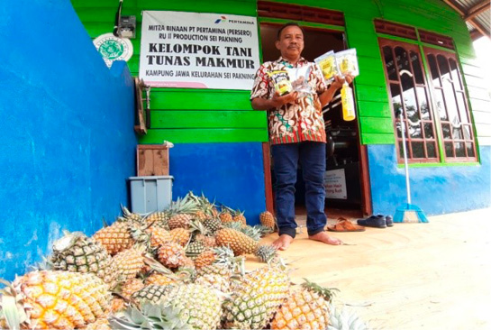 “From 2012 to 2015, there were many forest fires. Our peat area often experienced drought. It’s also due to the clearing of oil palm land in the west and in the east. Starting in 2016, we tried to plant the burned land with pineapples and Pertamina helped. Initially Pertamina helped provide training on fire fighting, fire prevention and infrastructure assistance such as hoses and water pump machines. They also help in terms of agriculture. Pertamina trained us by bringing trainers from Bandung who are experts in the pineapple field. The trainers teach us about how to plant pineapples, care techniques, and processed products” (Interview, Samsul, 27 July 2020).