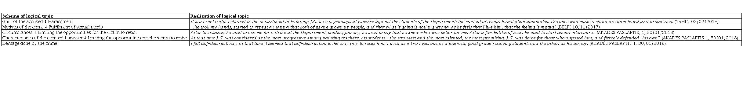 Testimonies of the victims of harassment posted on the website dedicated to the publication of the harassment facts Akadės paslaptis, as well as women’s confessions on Facebook accounts hashtagged MeToo, are rather fragmented in terms of thought consistency, text composition, and slightly incoherent, incomplete. Nevertheless, testimonies are connected by an almost identical topic, close to the topic of the speeches of legal accused persons. Logical topos should be interpreted “as a kind of abstraction, a medium, where one can find pre-made generalised schemes of argumentation, models of interpretation, and sets of assumptions. The logical topos is like a skeleton, a carcass that the addressee during the creation of discourse applies in a specific situation and fills with content” (Gabrėnaitė, 2010: 28). The application of schemes and models of the logic topic in the discourse, i.e. their concrete realization called the rhetoric topic. The rhetorical topos functions as a worded argument, a complete phrase that answers the question posed by the logic topic (Koženauskienė, 2005: 134).