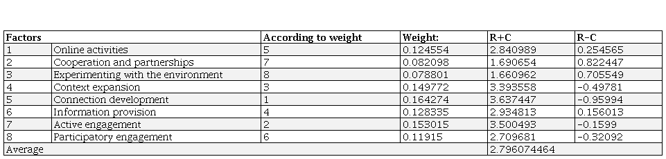 Factor evaluation importance was determined by (R + C) values. According to Table 1, connection development (CD) is the most important element whose highest value (R + C) is 3.637447, whereas the least important factor is experimenting with the environment (EE); here R + C – 1.660962. With regard to R+C values, factors set out according to the following priority of importance: connection development (CD) > active engagement (EA) > context expansion (CE) > information provision (IP) > online activities (OA) > participatory engagement (PE) > cooperation and partnerships (CP) > experimenting with the environment (EE).