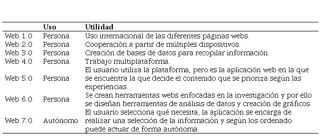 Desde el inicio de internet, se crea el término web 1.0 creando las páginas webs con una URL que comienzan con www que hacen referencia a “World Wide Web”. Posteriormente, se diseña la web 2.0, que tienen la intención de crear herramientas de colaboración, pues los equipos informáticos se vuelven algo habitual entre la ciudadanía y resultan útiles para poder trabajar de manera simultánea. En la web 3.0 se comienza a entender la posibilidad de internet como una herramienta de obtención de información, creándose las grandes bases de datos. La web 4.0 supone una evolución de la 2.0, pues si en esta tomaba relevancia el trabajo cooperativo, la 4.0 se centra más en las multiplataformas. Finalmente, la web 5.0 engloba muchas de las herramientas utilizadas actualmente como pueden ser las diferentes redes sociales donde el usuario controla la herramienta y a partir de su uso decide el contenido que aparece en la misma (Krol, 2020).