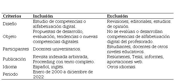 La búsqueda inicial reveló 401 artículos en inglés, 153 de los cuales eran duplicados y fueron eliminados de análisis posteriores. Se obtuvieron 191 artículos publicados entre enero de 2000 y diciembre de 2022. La búsqueda luego se centró sobre aquellos artículos que específicamente se alinearon con los objetivos de investigación sobre competencias digitales del profesorado universitario y los recursos TIC o proyectos educativos utilizados con los criterios de inclusión y exclusión indicados en la tabla 2.