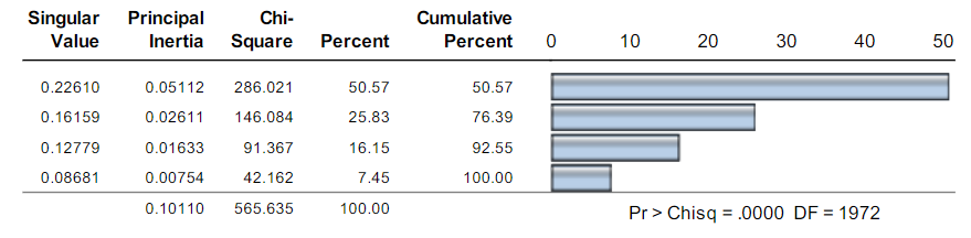 Los resultados del ACM y AF se utilizan como entrada al análisis de clúster o clasificación, donde se forman los grupos de individuos de características homogéneas, utilizando el método de agrupación de mínima varianza Ward. Los resultados —Tabla 2— permiten ver que con cuatro clústeres el R2 es del 80 %.