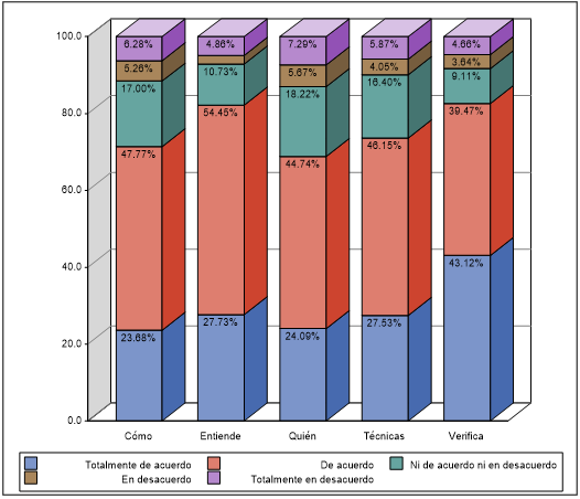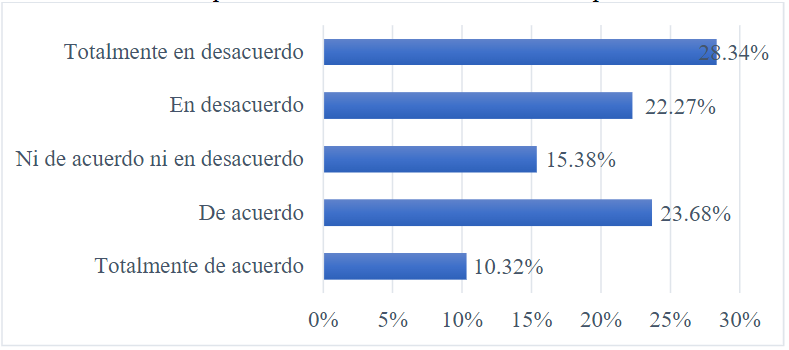 Elaboración propia.En relación con utilizar Internet para comunicarse con las autoridades —Figura 5—, el 28.34 % está totalmente en desacuerdo, el 22.27 % está en desacuerdo, el 15.38 % no está ni de acuerdo ni en desacuerdo, el 23.68 % está de acuerdo y el 10.32 % está totalmente de acuerdo.