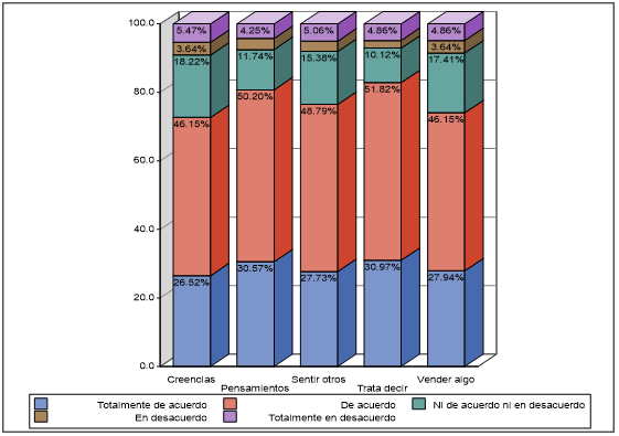 Elaboración propia.Categoría 2: Dimensión producción y difusión. Para esta dimensión, la pregunta identificada fue la 33 (P33), que consta de 5 ítems relacionados con buscar, recibir o compartir información en internet o redes sociales. Acerca de si se preguntan qué está tratando de decirle esa información (en la figura 2 aparece como “trata de decir”), 51.82 % está de acuerdo y solo el 30.97 % está totalmente de acuerdo. Sobre la cuestión analizar los pensamientos y sensaciones que le produce esa información (en la figura 2 aparece como “pensamientos”), el 50.20 % está de acuerdo y solamente el 30.57 % está totalmente de acuerdo. Respecto a preguntarse qué dice esa información sobre las creencias y formas de vida de otras personas (en la figura 2 aparece como creencias), el 46.15 % está de acuerdo y el 26.52 % está totalmente de acuerdo. En cuanto a si cuestionan cómo podrían pensar y sentir sobre esa información otras personas (en la figura 2 aparece como “sentir otros”), el 48.79 % está de acuerdo y el 27.73 % está totalmente de acuerdo. Para finalizar este ámbito, en relación a preguntarse si esa información está tratando de venderle algo (en la figura 2 aparece como “vender algo”), el 46.15 % está de acuerdo y el 27.94 % está totalmente de acuerdo.