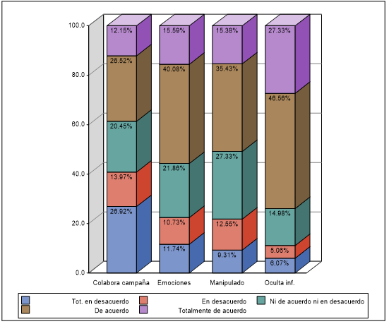 Sobre la cuestión de haber colaborado alguna vez en la creación de una campaña (o en su difusión), mediante envíos por correo electrónico o redes sociales a toda su lista de conocidos, que cuestionen los valores o estereotipos presentes en alguna producción mediática (anuncios, campaña publicitaria, serie de TV, etc.) (en la figura 3 aparece como “colabora campaña”), el 26.92 % está totalmente en desacuerdo; el 13.97 % está en desacuerdo; el 20. 45% no está ni de acuerdo ni en desacuerdo; el 26.52 % está de acuerdo; y el 12.15 % está totalmente de acuerdo. Acerca de si compra algún producto porque lo ha convencido el argumento de su publicidad, no se está moviendo por emociones (en la figura 3 aparece como “emociones”), el 40.08 % está de acuerdo y solo el 15.59 % está totalmente de acuerdo. En cuanto a considerar que cuando puede ver la realidad porque las noticias van acompañadas de imágenes, no corre tanto riesgo de ser manipulado (en la figura 3 aparece como “manipulado”), el 35.43 % está de acuerdo y el 15.38 % está totalmente de acuerdo. En lo que se refiere a haberse cuestionado alguna vez si se le ocultaba parte de una información (en la figura 3 aparece como oculta inf.), el 46.56 % está de acuerdo y solamente el 27.33 % está totalmente de acuerdo.