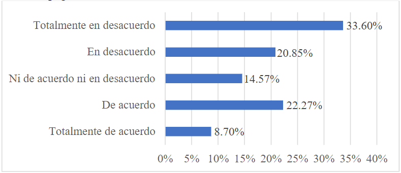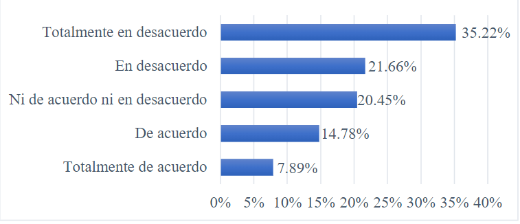 Elaboración propia.En cuanto a haberse dirigido a alguna institución para quejarse cuando la publicidad es inconveniente —Figura 8—, encontramos que el 35.22 % está totalmente en desacuerdo; el 21.66 % está en desacuerdo; el 20.45 % no está ni de acuerdo ni en desacuerdo; el 14.78 % está de acuerdo; y el 7.89 % está totalmente de acuerdo.